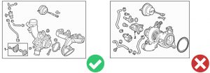 Tenga en cuenta que si su vehículo tiene la válvula que se muestra en la Figura 1, esta válvula se ajustará a su aplicación, sin embargo, la válvula que se muestra en la Figura 2 no será compatible con la válvula Forge. Hemos visto este cambio en vehículos producidos después de 2016, así que asegúrese de verificar antes de comprar su válvula Forge.